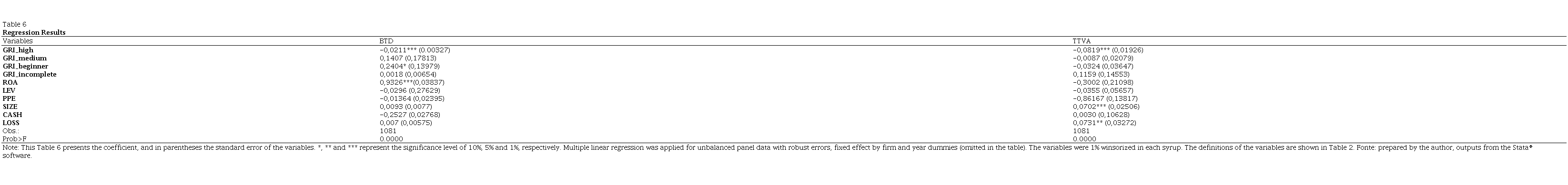 Table 6 presents the standard error and the p-value for each coefficient of each variable. To measure corporate social responsibility in Brazilian companies, dichotomous variables were used capturing advanced, intermediate, beginner and incomplete degree of CSR disclosure following the GRI guidelines while for tax aggressiveness, the book-tax-dfference (BTD) and total were used of taxes on added value (TTVA).