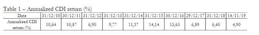 The annualized CDI return is the annualized Interbank Deposit Certificate (CDI) interest rate (%), extracted from the BACEN database (2020). The data are available in Table 1.