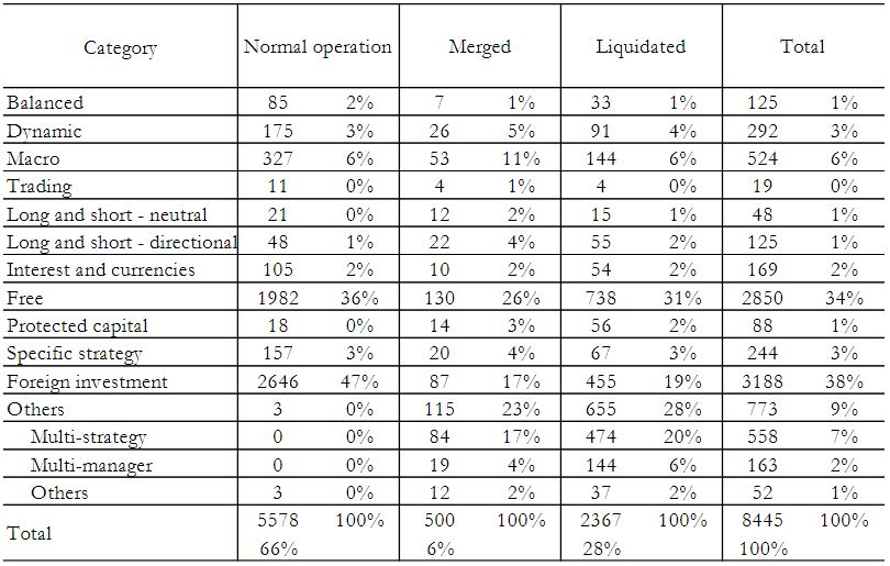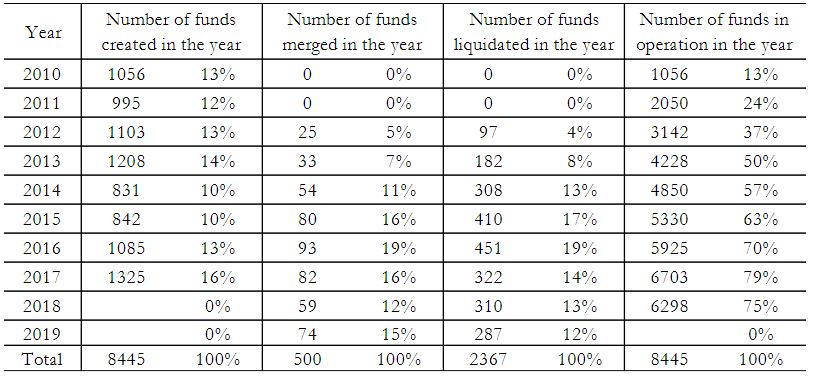 Table 4 presents the number of funds by category and status. Most of funds in normal operation (83%) are concentrated in the free (36%) and foreign investment (47%) categories. The same situation occurs in the case of merged (free = 26% and foreign investment = 17%) and liquidated funds (free = 31% and foreign investment = 19%).
