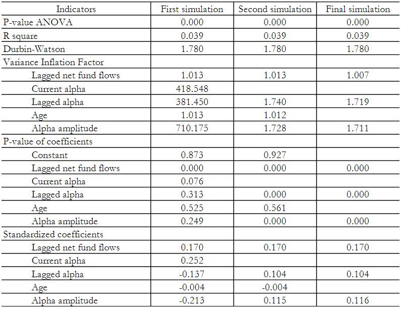 In the final simulation, three independent variables remained in the model because the p-value is less than 0.05 (lagged net fund flows = 0.000; lagged alpha = 0.000; alpha amplitude = 0.000).