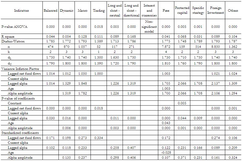 Lagged alpha is significant in 10 (90,9%) of the 11 categories. Lagged net fund flows is significant in 7 (63,6%) of the 11 categories. Alpha amplitude variable is significant in 9 (81,8%) of the 11 categories.