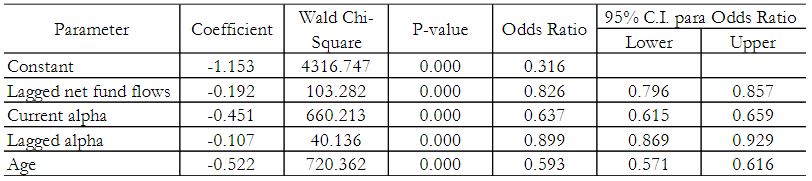These results confirm hypotheses 6, 7 and 8. Thus, it can be concluded that current and lagged alphas, and lagged net fund flows negatively influence the probability of liquidation or merger of fund. On the other hand, hypothesis 9 is not confirmed, that is, age does not affects positively the probability of liquidation or merger of fund.