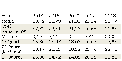 Acerca da evolução dos percentuais de aplicação de recursos municipais em saúde, no período de 2014-2018 (Tabela 1), as comparações anuais sugerem tendência sutil de aumento, ou pequena alteração para um maior patamar. Enquanto o percentual médio aplicado em 2014 foi de 19,72%, a média do ano de 2018 ficou em 22,67%. Comportamento semelhante também se verifica para a evolução do 3º quartil e do valor máximo dos percentuais aplicados anualmente. Em 2014, o valor de 23,90% para o 3º quartil revela que ¼ dos municípios analisados realizaram aplicações maiores ou iguais àquele valor, enquanto em 2018, o 3º quartil aumentou para 25,81%. Por sua vez, o valor máximo observado para 2014 foi de 39,38%, enquanto em 2018 o valor máximo foi de 53,23%. Quanto ao grau de discrepância das aplicações anuais, enquanto em 2014 a dispersão estava em 37,72% da média observada naquele ano, ao longo dos anos seguintes, as dispersões se reduziram substancialmente, fechando o ano de 2018 com um coeficiente de variação correspondente à 20,95% da média observada para aquele ano.