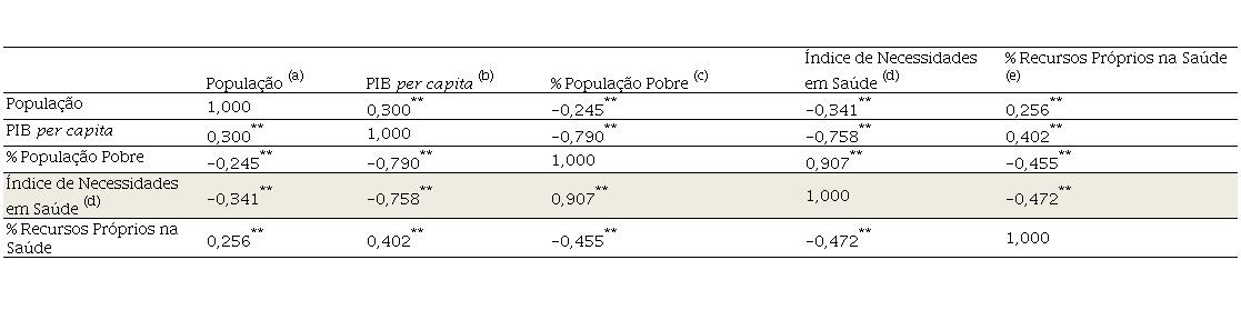 Os resultados (Tabela 2) indicam que o tamanho populacional do município está diretamente relacionado com o seu PIB per capita e com o percentual de recursos próprios aplicados na saúde, enquanto se relaciona inversamente com o percentual de população pobre e seu índice de necessidades em saúde. Por sua vez, o PIB municipal per capita se relaciona diretamente com o percentual de recursos próprios aplicados na saúde e se relaciona inversamente com o percentual de população pobre e, ainda, com índice municipal de necessidades em saúde. O percentual de população pobre se relaciona diretamente com índice municipal de necessidades em saúde e inversamente com o percentual de recursos próprios aplicados na saúde.