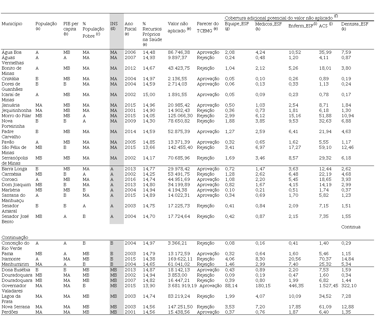 Os resultados da Tabela 3 permitem responder à segunda e terceira indagações levantadas na introdução deste artigo, quais sejam: (ii) qual a representatividade do montante de recursos não aplicado pelos municípios autuados pelo TCEMG, em termos de cobertura adicional potencial de recursos humanos na saúde? (iii) em que medida os resultados dos pareceres prévios emitidos pelo TCEMG, a respeito das contas dos municípios deficitários, apresentam coerência com o nível de necessidades em saúde desses municípios?
