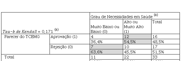 De maneira a completar à análise referente aos 33 municípios deficitários, utilizou-se de análises de frequências e do Coeficiente tau de Kendall para medir o grau de aderência ou de associação entre os pareceres emitidos pelo TCEMG e o nível de necessidades em saúde dos municípios, sendo essas variáveis previamente transformadas em variáveis ordinais dicotômicas, conforme a seguir: parecer emitido pelo TCEMG em relação ao montante não aplicado (“rejeição” = 0 ou “aprovação” = 1); grau de necessidades em saúde do município (“muito baixo” ou “baixo” = 0 ou “alto” ou “muito alto” = 1). Essa análise partirá do pressuposto de que quanto maior a correlação entre essas duas dimensões, maior o percentual de acerto técnico na decisão tomada pelo TCEMG e, portanto, maior seria a objetividade e a eficácia da aplicação do princípio da insignificância. 7