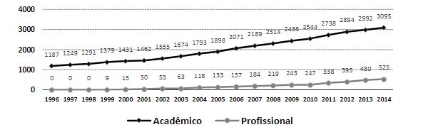 No gráfico abaixo observa-se o quantitativo de programas de mestrado acadêmico e profissional. Importante registrar que os dados levantados naquele momento abrangeram o período de 1996 a 2014, no entanto, pode-se aferir a taxa de crescimento dos programas de parte do intervalo em estudo, 2008 a 2014.