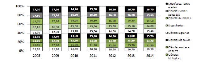 Como reflexo do número de programas de mestrado, as áreas de linguística, letras e artes, ciências sociais aplicadas e ciências humanas apresentaram destaque a participação de formações de mestres dentro do período analisado em comparação com as demais áreas. Em 2014 estas áreas alcançaram, respectivamente 16,7%, 15,9%, 15,5%. Todavia, as áreas de engenhara e de ciências exatas e da terra não ficaram muito atrás, 14,8% e 13,2 %, em números de 2014.