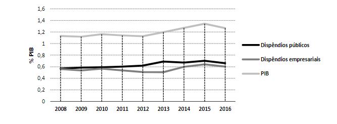 Dados abertos do MCTIC (2019) indicam que o investimento feito em P&D no Brasil tem crescido a uma taxa média acumulada de 11% de 2008 a 2016, e comparando os valores totais aportados em 2008 com o de 2016 identifica-se o crescimento de 126%. Em termos da divisão do investimento público e empresarial, em média são proporcionais. No período estudado o valor investido de natureza pública somou R$275 bilhões de reais e em contrapartida o investimento privado somou R$242 bilhões de reais, uma diferença de R$32 bilhões de reais. O gasto médio anual do setor público foi de R$32,22 bilhões de reais e em contrapartida o gasto médio anual do setor privado foi de R$28,19 bilhões de reais. Dentro deste período a variação média acumulada do investimento público e privado tiveram o mesmo percentual, 11%.