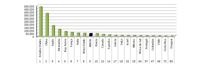 Comparando o desempenho das publicações em relação aos países do BRICS (China, Índia, Rússia e África do Sul), com países vizinhos (México e Argentina) e países desenvolvidos como Alemanha, França, Canadá, Espanha e Japão, o Brasil ficou apenas a frente da Rússia, e atrás da Índia e da China. Registra-se que o fator de impacto do Brasil foi o mesmo do que da Índia, 0,78, mesmo tendo 96.613 a menos de publicações, o que sugere um melhor fator de impacto final das publicações brasileiras em relação as indianas e, perde em fator de impacto para a África do Sul que, com apenas 73.663 alcançou 1,11 de impacto. Com relação aos países desenvolvidos, o Brasil de fato fica muito atrás tanto em quantidade como em fator de impacto, entretanto mantem folga em relação ao México e Argentina. Com relação a colaboração nas publicações do setor industrial, o Brasil também fica atrás, exceto perante a Índia e a Rússia. O caso da China em todos as comparações é um ponto fora da curva.