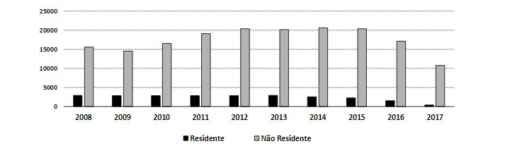 Analisando os dados disponibilizados por INPI (2019) destaca-se a notória desvantagem tecnológica que o país está enfrentando em número de depósitos. A grande maioria são de não residentes que em média depositaram ao ano 22.735 patentes. Os residentes apenas depositaram em média 4.718, uma diferença de 18 mil depósitos de patentes em média por ano. Dentro do período em estudo, 2008 a 2017, o total de depósitos nacionais somaram 47.189 e de não residentes 227.353, o que representa 17% de depósitos de residentes e 83% de não residentes.