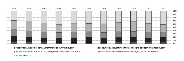 Abaixo apresenta-se o gráfico 7 de exportação de produtos da indústria de transformação por intensidade tecnológica, utilizando a classificação da OCDE (GALINDO; VERGER, 2016), e demais produtos não classificados quanto a intensidade tecnológica (N.C.I.T). Os resultados revelam e materializam a realidade apresentada pelos resultados de Cornell (2018) e sugere o reflexo dos resultados dos demais indicadores estudados. Revelam a predominância da exportação de commodities e de produtos de baixo valor agregado. Dos dados brutos coletados, identifica-se alguns pontos de certa relevância: em 2017 e 2018 ocorreu um leve aumento das exportações (média acumulada de 2%) de produtos de alta tecnologia. Entretanto no mesmo período o crescimento das exportações de commodities e de produtos de baixo valor agregado foi muito superior (média acumulada de 28%). No mesmo período, as importações de comodities e de produtos de baixo valor agregado foram três (3) vezes menor que as respectivas exportações, mas em contraponto as importações de produtos da indústria de transformação de alta e média alta tecnologia representaram, respectivamente, 3,5 a 2,0 vezes a mais do que as exportações, revelando acentuada dependência internacional de produtos intensivos em tecnologia.