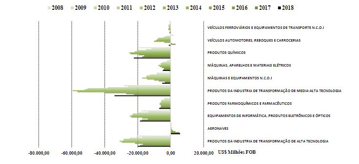 Afere-se a soma do déficit tecnológico das indústrias de alta e de média-alta tecnologia pela média acumulada de déficit da balança comercial das indústrias de alta e de média-alta no período de 2008 a 2018 foi de US$ -62.852,20 milhões (FOB). A resultante sugere que o Brasil, historicamente, sofre um processo grave de desindustrialização na maioria dos setores de alta e média-alta tecnologia (a exceção a de aeronaves). Voltando ao resultado geral da balança comercial brasileira, que nos últimos anos (incluindo 2018), apresentou superávit, os dados brutos revelam que este resultado foi alavancado quase que exclusivamente pela exportação das commodities e dos produtos de baixo valor agregado. Durante o estudo também ficou claro que o comportamento da balança comercial também foi afetado pelos preços das commodities estipulado pelo mercado externo. Dados da UNCTAD (2019) indicam que entre 2017 e 2018 os preços das commodities sofreram 17% e 16% de aumento respectivamente.