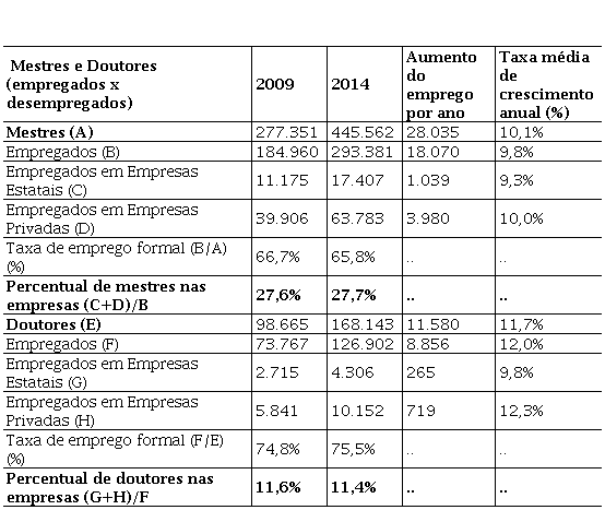 Correlacionando o número total de profissionais doutores e mestres atuando no setor empresarial (95.648) por atividade econômica (GALINDO; VERGER, 2016), conclui-se que apenas 16,9% (16.134) estão na indústria de transformação, ou seja, aplicando tecnologia intensiva e ou desenvolvimento tecnológico. Refinando o resultado, com foco na indústria intensiva, a indústria de transformação avançada (aeronaves, farmacêutica e de informática, eletrônicos e produtos óticos), o número cai consideravelmente para 3,1% dos 95.648 profissionais mestres e doutores absorvidos pelas empresas.