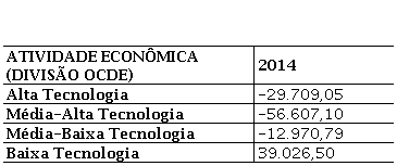 Fazendo um comparativo com os resultados da balança comercial destas atividades econômicas para o ano de 2014, tabela 2 abaixo, identificamos déficit de exportação da nossa indústria nacional de transformação principalmente na produção de tecnologias intensivas (alta, média-alta e média-baixa tecnologia)1. Existem diversas variáveis que levam a este resultado, contudo, é relevante a necessidade de profissionais especialistas, com competências complexas, no corpo técnico de empresas, principalmente quando se trata de indústria intensivas e de desenvolvimento de novas tecnologias (CNI, 2016; FERREIRA, 2016).