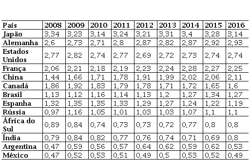 Interessante também comparar o percentual do investimento em P&D com relação ao PIB com os demais países do BRICS (China, Índia, Rússia e África do Sul), com países vizinhos (México e Argentina) e países desenvolvidos como Alemanha, França, Canadá, Espanha e Japão (tabela 3).
