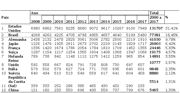 Na tabela abaixo apresenta-se o ranking de países depositantes no Brasil (INPI, 2019). Destaca-se que os depósitos dos residentes deixam o Brasil na segunda colocação. A hegemonia dos Estados Unidos no desenvolvimento de tecnologia também se demonstra em nosso território, com 31,4 % de todos os depósitos protocolados no INPI de 2000 a 2017 (419.327). Os depósitos nacionais responderam com 18,4% deste total, mas devemos nos questionar se de fato são de CPFs e de CNPJs de empresas de origem nacional. Curiosamente a China está na décima segunda colocação e sua representação no total de depósitos de 2000 a 2017 é de apenas 1,3%. Os números materializam a realidade da busca pela soberania tecnológica como política de desenvolvimento nacional pelos Estados Unidos e demais países desenvolvidos, expandindo seus negócios no Brasil. Mesmo o Brasil sendo uma país que ao longo de décadas busca estreitar parcerias econômicas com os americanos (BRASIL, 2020), a sociedade americana entende que, em se tratando de desenvolvimento tecnológico e de conhecimento de ponta, é necessário buscar proteger mercado através de patentes, proporcionando retorno do investimento e ganhos econômicos (QUINTELLA; TEODORO, 2013).