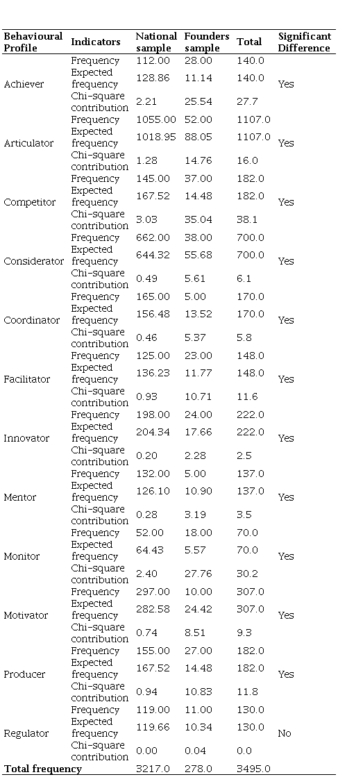 The results indicated that the proportions between the two samples were significantly different for the following profiles: Achiever (pNational = 3.5% vs. pFounder = 10.1%), Articulator (pNational = 32.8% vs. pFounder = 18.7%), Competitor (pNational = 4.5% vs. pFounder = 13.3%), Considerator (pNational = 20.6% vs. pFounder = 13.7%), Coordinator (pNational = 5.1% vs. pFounder = 1.8), Facilitator (pNational = 3.9% vs. pFounder = 8.3%), Innovator (pNational = 6.2% vs. pFounder = 8.30%, p<5%), Mentor (pNational = 4.1% vs. pFounder = 1.8), Monitor (pNational = 1.6% vs. pFounder = 3.6%), Motivator (pNational = 9.2% vs. pFounder = 3.6%), and Producer (pNational = 4.0% vs. pFounder = 9.7%).