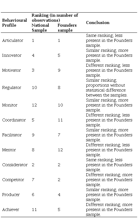 The Articulator profile and the Considerator profile, for example, occupied positions 1 and 2, respectively, in the two samples. The Motivator profile ranked 3 in the national sample and 10 in the founders sample; the Coordinator profile, position 5 in the national sample and 11 in the founders sample; Achiever, position 11 in the national sample and 4 in the founders sample; and Competitor, 7 in the national sample and 3 in the founders sample. Table X presents a comparison between the rankings of the profiles by sample, enabling us to confirm the H2 of the study, since there are both more present and more absent profiles in the founders sample.