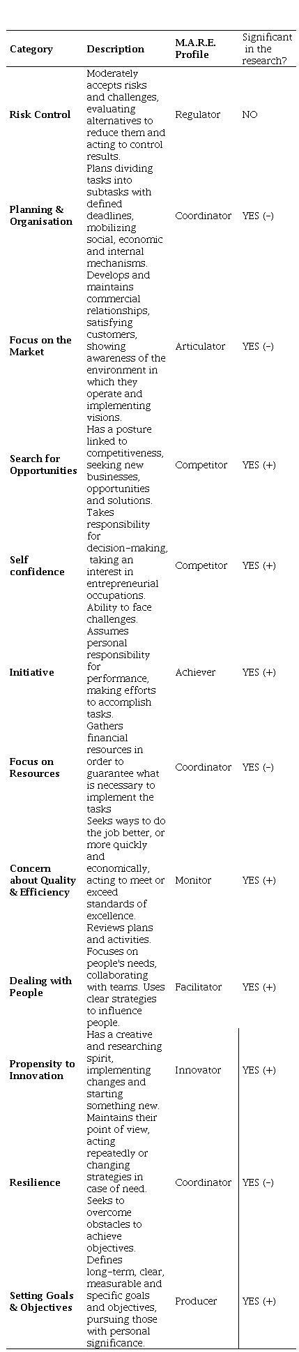 Furthermore, the profiles considered in the research and their corresponding behavioural characteristics also served as a basis for a comparison with those listed in the relevant literature, as presented in Table II and representative of the entrepreneurial profile. The result of this comparison can be analysed in Table XII.