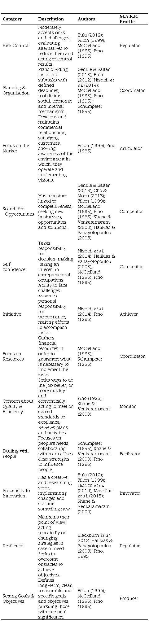 Behavioural characteristics of the entrepreneur are also related to what is known as strategic posture, which is defined as thinking about the business on a future basis and is more frequently displayed by male rather than female entrepreneurs (Mohammed, Ibrahim, & Mohammad Shah, 2017). Coda et al. (2018) presented a summary table (Table II) that categorizes, describes and relates the behavioural characteristics of entrepreneurs with the M.A.R.E. profile, a diagnostic tool that will also be used in the present research.