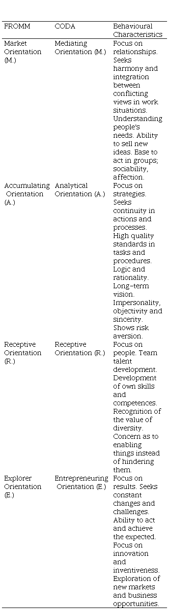The characteristics of motivational orientations with a comparison between the authors Fromm (1986) and Coda (2000) is presented in Table III. The approach considers that professionals use these 4 orientations when performing tasks, and the differences between individuals occur in relation to the intensity and order of preference for each of them.
