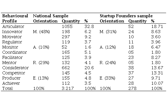 Table V presents the results obtained for the distributions of Motivational Orientations and Behavioural Profiles considering the national sample (taken as a reference for comparison) and the startup founders sample obtained in the study.