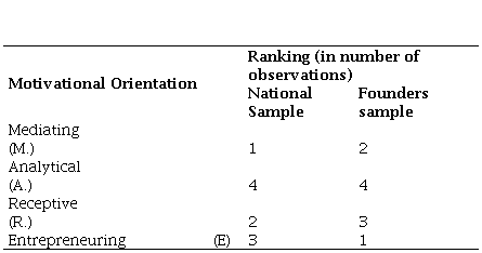 To investigate the typical differences in motivational orientations and behavioural profiles, two different samples were used: Founders and National. These independent variables of the study can only be assessed by applying the M.A.R.E. Diagnostic. A recommendation for addressing this potential methodological bias is to investigate whether the study of these variables can also be applied to other contexts (Podsakoff et al., 2003). We also suggest that one way of dealing with this bias is to observe the M.A.R.E questionnaire reliability measures (Cronbach’s alpha), as follows: Mediating orientation .80; Analytical orientation .82; Receptive orientation: .83 and Entrepreneuring orientation .80.