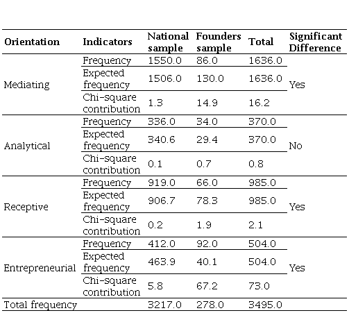 To assess which orientations differed between the samples, we analysed the Chi-square contribution for each sample and factor. The results indicated that the proportions between the two samples were significantly different for the following orientations: Mediating (pNational = 48% vs. pFounder = 31%), which is more prevalent in the national sample; Entrepreneuring (pNational = 13% vs. pFounder = 33%), which is more prevalent in the founders sample; and Receptive (pNational = 29% vs. pFounder = 24%), which is more prevalent in the national sample. There were no statistically significant differences between the two samples when considering Analytical orientation (pNational = 10% vs. pFounder = 12%). Table VIII presents the results of the comparison.