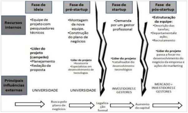 A segunda etapa é a de pré-startup, leiamos, pré-spin-off acadêmica, nesta etapa é introduzida a decisão real de se desmembrar da universidade; o líder do projeto provou que é possível a execução e busca assessoria para construir um plano de negócio e para montar a equipe que irá conduzir a ideia até o final. Entre a segunda e a terceira etapas ocorre a legalização da empresa. Na terceira etapa normalmente a empresa demanda por um gestor profissional, dada a compreensão pela equipe de que o gerente do projeto campeão, pesquisador, normalmente não é dotado de capacidade de conduzir a empresa no mercado competitivo, esta etapa é chamada de fase de startup, de spin-off acadêmica. A fase de pós-startup ou de pós-spin-off acadêmica é desencadeada por rápidas evoluções tecnológicas, esta etapa se caracteriza por ganhar foco estratégico e profissionalização da equipe da organização.