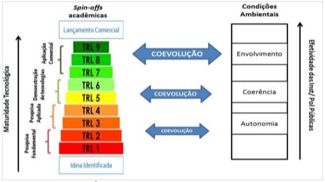 Este framework é baseado na ideia central de que os níveis de maturidade das tecnologias das spin-offs acadêmicas, neste estudo mensuradas por meio da escala Technological Readiness Level (TRL), coevoluem, influenciados por meio de processos de aprendizagem tecnológica das firmas (DUTRÉNIT, 2000; NONAKA, TAKEUCHI; UMEMOTO, 1996) e por políticas públicas de fomento à inovação, que afetam o ambiente de empreendedorismo acadêmico e ao mesmo tempo com as trocas destes grupos com a sociedade (RODRIK, 1993; CÂMARA; BRASIL, 2015; EDLER; FAGERBERG, 2017).