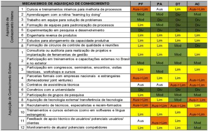 Também foi possível observar que os resultados mais significativos derivaram dos mecanismos de aquisição interna de conhecimento com a forte contribuição dos trabalhos realizados em redes combinado com mecanismos externos, com destaque para atuação de convênios com a universidade, outros grupos de pesquisa nacionais e estrangeiros, parcerias para interações de P&D com clientes e a participação em treinamentos, cursos, palestras, workshops e visitas técnicas que interagindo contribuíram para os avanços das tecnologias estudadas.