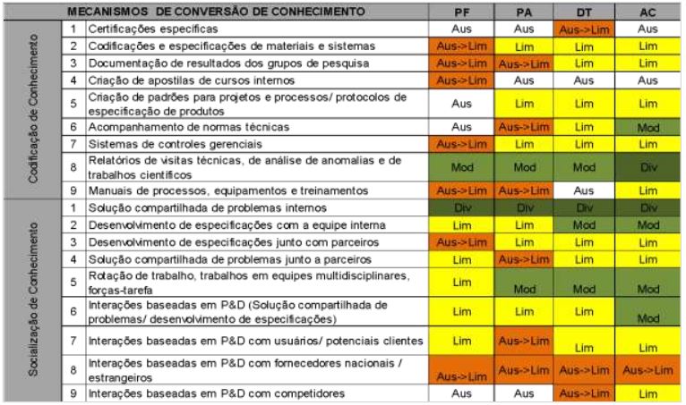 Como a literatura aponta e o framework analítico mostra o processo de aprendizagem é um dos fatores mais relevantes na evolução tecnológica das empresas inovadoras. Neste trabalho procurou-se estabelecer uma relação da intensidade com que as atividades de aquisição e conversão do conhecimento foram realizadas pelas empresas estudadas. Percebe-se que as empresas em seu nível inicial de evolução usaram de forma moderada a maioria dos mecanismos exceto a socialização. Parece que neste momento as empresas estão ainda no início de seus processos e provavelmente pelos riscos inerentes a este momento os investimentos (alocação de recursos humanos e financeiros) nestes processos acabam sendo menores. Já a socialização foi considerada fraca, o que pode ser entendido como característica de um ambiente cuja relações ainda estão se consolidando (Quadro 5). Os sistemas físicos, sistema organizacional e produtos e serviços (LALL, 1992; BELL; PAVITT, 1995, 1997; FIGUEIREDO, 2004) evoluem nas organizações ao longo do tempo com o acúmulo de conhecimento destes negócios o que justifica em parte o aumento no nível de evolução tecnológica das empresas.