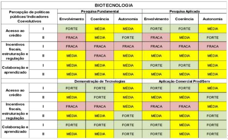 A Figura 8 mostra o display gerado conforme o estabelecido na seção de metodologia e apresenta como se ocorreu a relação entre as variáveis coevolutivas envolvimento, coerência e autonomia, bem como a percepção da relação da evolução das políticas públicas e a maturidade tecnológica das tecnologias core das spin-offs acadêmicas em potencial da área de biotecnologia.