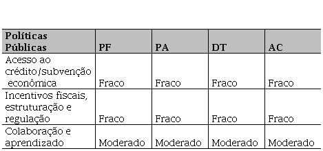 Com relação ao terceiro construto do framework analítico utilizado, políticas públicas, estabeleceu-se, novamente a divisão por setores, dada suas especificidades neste campo. Contudo, de uma forma geral, as políticas públicas, como aqui avaliadas, não parecem contribuir de forma importante para a evolução tecnológica de ambos os setores. Contudo, as empresas de biotecnologia tiveram uma execução moderada das políticas de acesso ao crédito e influentes somente nos dois primeiros níveis de evolução tecnológica, muito provavelmente pelo acesso no Estado do Ceará, aos editais de subvenção econômica (Quadro 6).