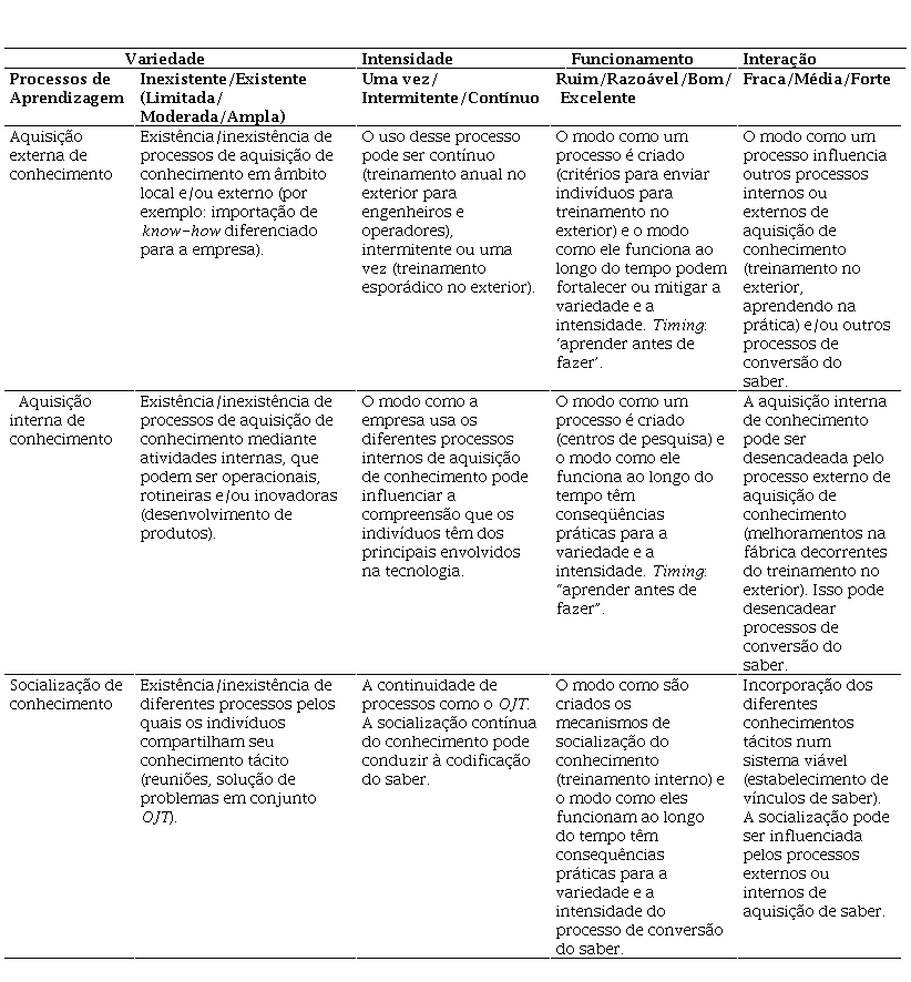 A variedade é compreendida como a presença de diferentes processos de aprendizagem na empresa e pode ser avaliada no que tange aos processos de aquisição de conhecimento e aos mecanismos de conversão, a variedade de processos de aquisição de conhecimento são importantes para convertê-los de individuais para organizacionais. A intensidade ocorre por meio da repetição ao longo do tempo de criação, atualização, aprimoramento e/ou fortalecimento de processos de aprendizagem, a intensidade assegura o fluxo constante de conhecimento circulando na organização, permitindo a melhor compreensão de tecnologias adquiridas e a conversão do aprendizado do indivíduo para a organização. O funcionamento é a forma que o aprendizado opera no decorrer do tempo, Dutrénit (2000) destaca que os processos podem fortalecer ou impactar os resultados organizacionais se conduzidos de maneira desordenada, esta característica determina a força do processo de aprendizado. A interação é a maneira como os processos de aprendizagem têm influência mútua.
