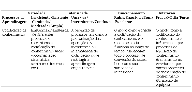 A variedade dos processos de aprendizagem foi avaliada conforme a existência ou não destes processos, variando de 1 a 5 (ausência do processo até ampla variedade do processo), já em intensidade foi observado a intensidade de ocorrência dos processos de aprendizagem, variando de 1 a 5 (ocorrência uma vez até contínua). O funcionamento dos processos de aquisição e conversão de conhecimento foi avaliado conforme a sua realização, considerando os índices indicados de 1 a 5 (fracasso até sucesso).