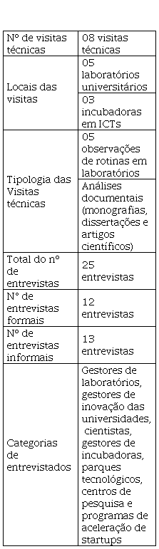 Foram realizadas doze entrevistas formais com sete gestores e cinco cientistas responsáveis ou corresponsáveis principais pelo desenvolvimento da tecnologia core de spin-offs acadêmica em potencial. O tempo médio das entrevistas variou de uma a duas horas e trinta minutos. Ainda foram feitas treze entrevistas informais, sendo sete por telefone e seis presenciais com gestores de incubadoras, parques tecnológicos, centros de pesquisa, gestores de programas de aceleração de startups e com gestores de inovação e pesquisadores das universidades (Quadro 2).