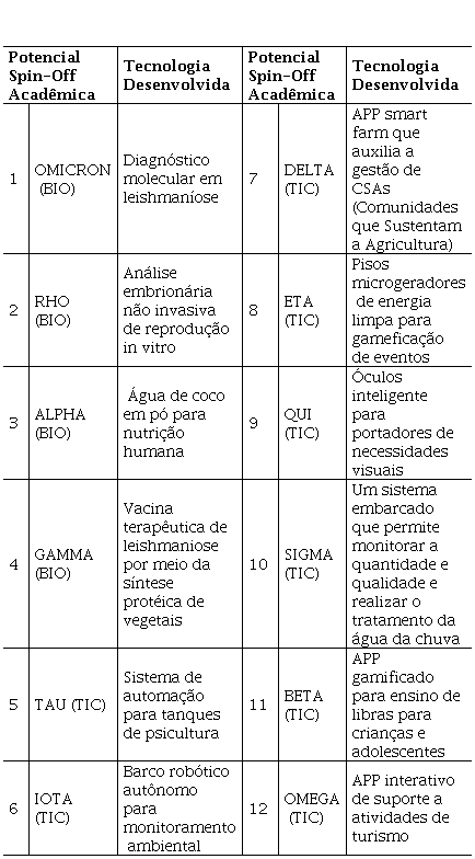 Os resultados foram baseados na análise das seguintes spin-offs e suas tecnologias centrais, separadas em dois setores: i) Tecnologia da Informação e Comunicação (TIC), com oito empresas estudadas: Tau, Iota, Delta, Eta, Qui, Sigma, Beta e Omega e; ii) Biotecnologia BIO), com quatro empresas: Omicron, Rho, Alpha e Gama (Quadro 4).