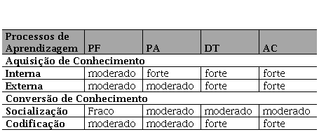 Avaliou-se, na percepção das empresas estudadas, qual a intensidade da relação dos diferentes processos de aprendizagem e os níveis de evolução tecnológica (PF, PA, DT e AC). Percebe-se que as empresas consideram a aquisição interna como o mecanismo que tem uma relação forte com todos os níveis de evolução tecnológica e ao contrário a socialização como tendo uma fraca relação todos níveis (Quadro 3). O que revela menos propensão à inovação mais aberta e de menor interação interna. O que de muitas formas é preocupante para o sucesso de empresas inovadoras de base tecnológica criadas em ambientes acadêmicos e que a literatura indica que, normalmente se associam a redes internas e externas de conhecimento como fator de sucesso, parece que o perfil de colaboração dos gestores e atores envolvidos, tanto nas empresas, como provavelmente no ambiente externos, não são adequados.