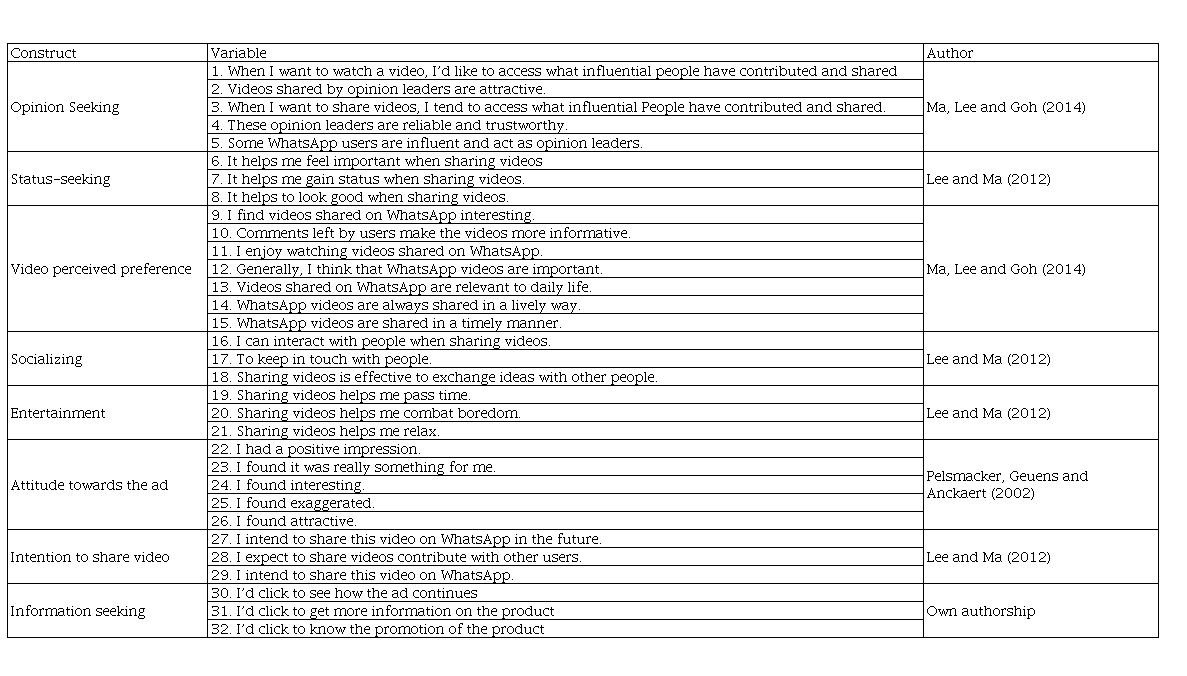 We added two discriminant questions in the questionnaire that needed to be answered by the respondents: the frequency of the use of WhatsApp and the frequency of sharing videos. If the respondent did not use WhatsApp or share videos, these forms were not considered in the data analysis. In order to measure Opinion Receiver (OR), Perceived Preference of Videos (PP) and Intention to Share Videos (IS), scales were adapted from the studies of Ma et al (2014). Scales to measure Status-Seeking (SS), Socialization (SO) and Entertainment (ES) were adapted from Lee and Ma (2012), and the Attitude Towards the Ad (AD) scale was adapted from Pelsmacker, Geuens and Anckaert (2002) (Table 1). Lastly, we developed the scale of Information Seeking (IS). All the statements used a seven-point Likert scale.