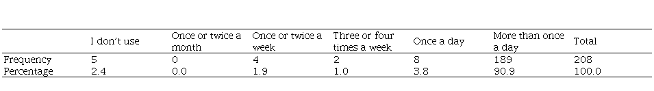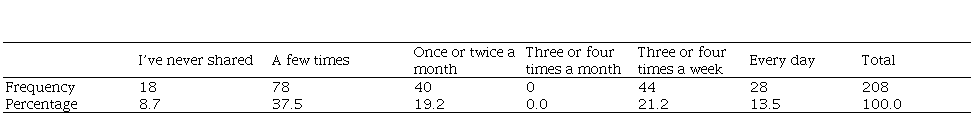 Only five people out of 208 do not have WhatsApp, and of those who have it, more than 90% of its use is more than once a day. 18 respondents of all have never shared videos, including the ones who do not have WhatsApp. In other words, 13 respondents do not share videos. Almost 35% of all respondents share videos three times a week or more.