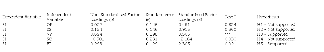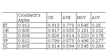 The first study was carried out with 190 respondents because 18 was removed in the filters questions. The first step was to analyze Cronbach’s Alpha and convergent and discriminant validities of the constructs (Table 5) and then, test the hypotheses by Structural Equation Modelling using the AMOS. Convergent and discriminant validities are well adjusted according to the literature (Byrne, 2013) so that we started the hypotheses tests. To test the first five hypotheses (Table 6), the following values were obtained: CMIN/DF (2,389); CFI (0.91), IFI (0.91) and TLI (0.90).