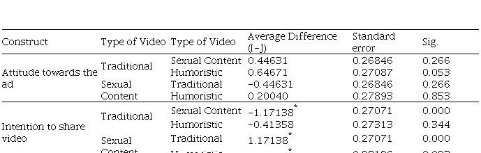 Table 7 presents the results of the post hoc Hochberg GT2 test indicated when there are disparate numbers in each sample group. We can perceive that there are significant differences in attitude towards the ad between functional and humor appeals. Furthermore, we also found differences in intention to share videos between sexual and functional and sexual and humor appeals.