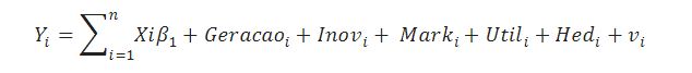 Onde, i representa os respondentes, Yi é a variável dependente dicotômica de resultado para intenção de consumo on-line (1-sim, 0 c.c.) no modelo 1 e intenção repetição de consumo on-line no modelo 2, Xi é uma matriz de variáveis com características socioeconômicas (gênero, renda, escolaridade, ocupação, estado civil, zona de moradia) de controle, Geracaoi refere-se à geração do indivíduo i se tradicionalistas, BB, X, Y, Z e alfa, Inovi representa personalidade à inovação para todos os modelos; e Marki para influência das ferramentas de marketing digital, Utili para o consumo utilitarista, Hedi para o consumo hedônico no modelo 2 , e vi o termo de erro aleatório.