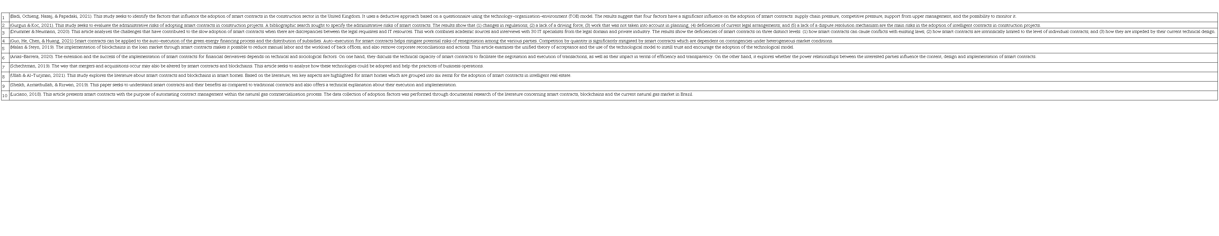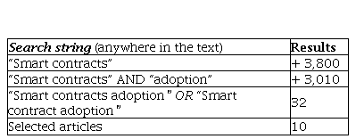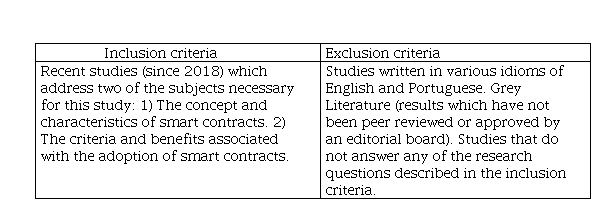 We have performed a systematic review of the literature to identify the main characteristics and adoption factors for smart contracts in the opinion of researchers in this area. We opted to search Google Scholar for the words “smart contracts” in any place within texts, restricted the publications to those since 2018, and excluded citations and patents, and searched for review articles in any language, classifying them by relevance. This search yielded more than 3,800 publications. Then we added the condition of searching for “smart contracts” AND “adoption”, and this time the search resulted in 3,010 publications. To increase the accuracy of the process, we altered the string search to be “smart contracts adoption” OR “smart contract adoption” located anywhere in the text, while maintaining the same initial parameters in Google Scholar, and this search resulted in 32 publications. The articles were analyzed and the protocol of the criteria presented in Table 1 was applied which ended up selecting 10 articles for this study.