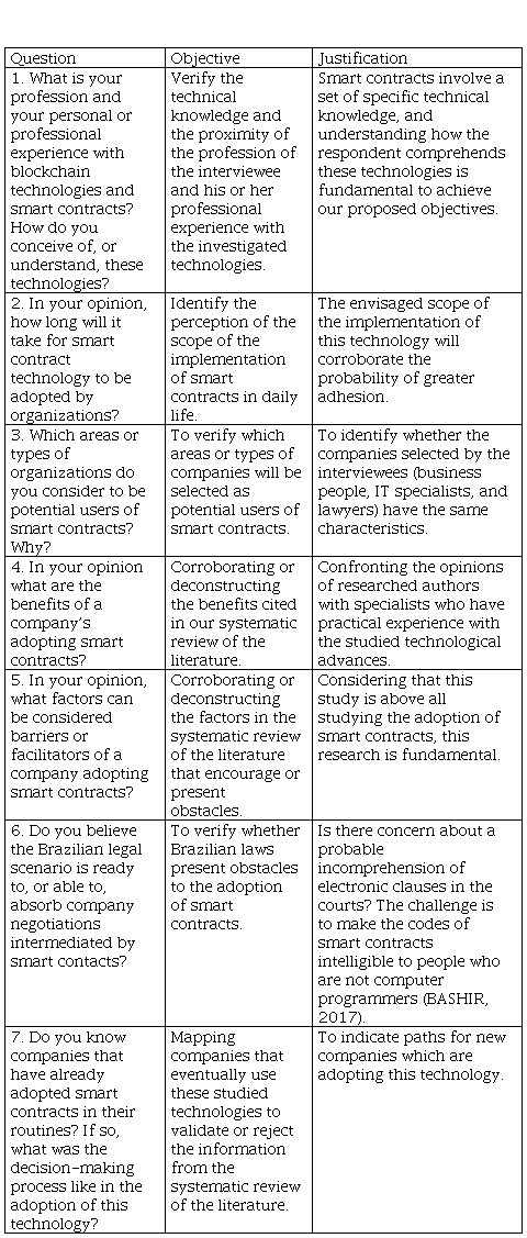 To delve deeper into the theoretical definitions and the practical results obtained from the articles selected through the systematic review of the literature, we realized interviews utilizing semi-structured questionnaires as displayed in Table 4. These were applied to business people, IT professionals, and lawyers specializing in digital rights who were selected based on ease of access. The selection of IT professionals is justified based on our interest in technical views of smart contracts, while business people and lawyers were selected intentionally to give us a business perspective of the adoption of technology in this study.