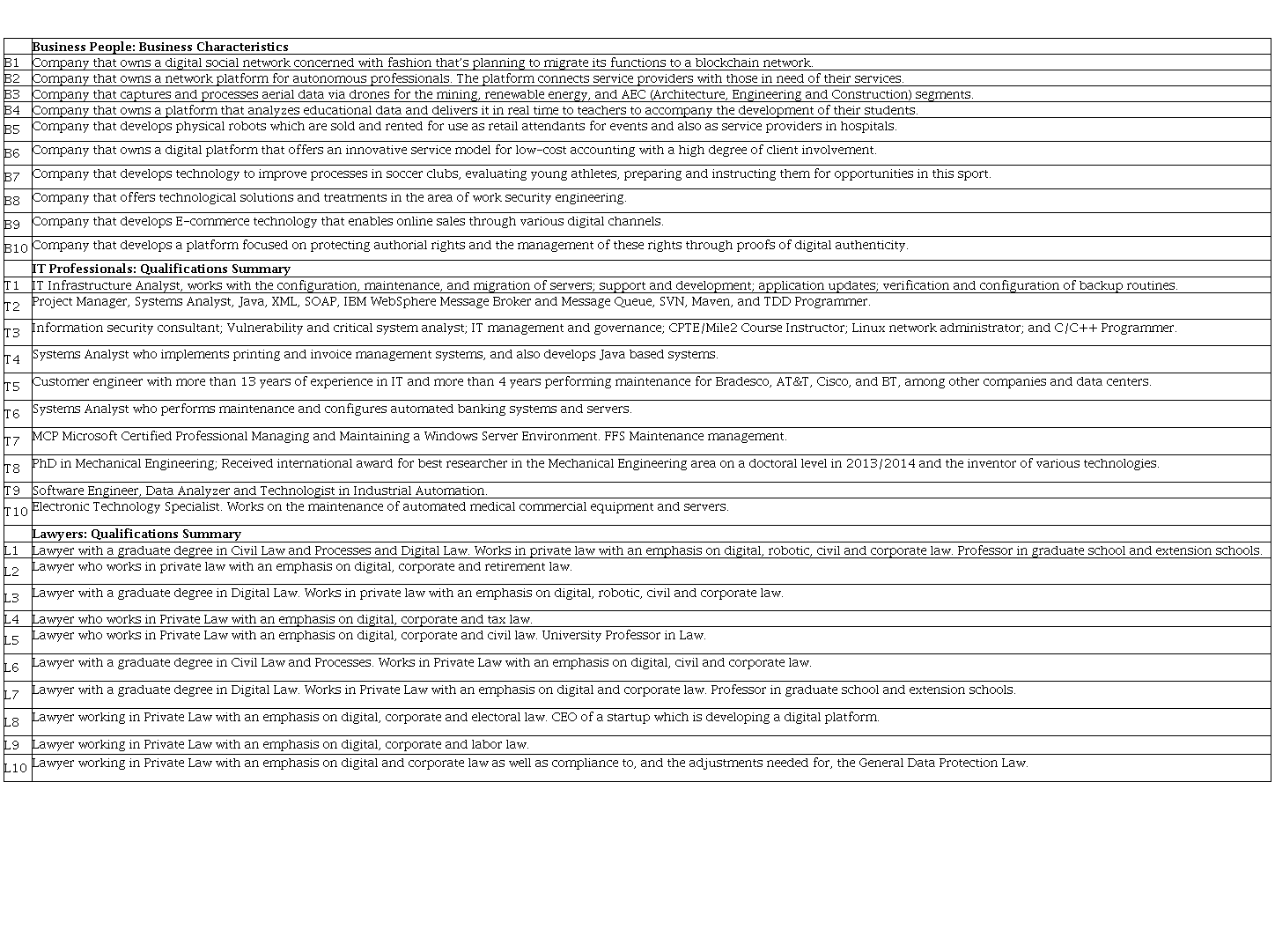 The semi-structured interviews occurred during the second bimester of 2022. Each interview lasted on average of 32 minutes and involved 30 individuals: 10 IT business people, 10 IT professionals, and 10 lawyers specializing in digital law. The number of participants was selected to meet the saturation criteria recommended by Bauer and Gaskell (2008). The sessions were realized through videoconferences recorded for subsequent transcription, and the questionnaire in Text Table 4 was used to assist researchers in conducting these interviews. The treatment of the data was performed through the use of content analysis of the transcriptions as indicated by Bardin (2011). All of the ethics committee’s recommendations were respected. Text Table 5 presents information about the activities of the business people, IT professionals, and lawyers who accepted our invitation to be interviewed.