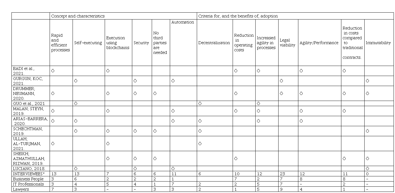 To accomplish this, we have selected 10 articles through a Systematic Review of the Literature, summarizing the adoption characteristics and factors indicated by researchers. We then conducted 30 interviews (10 business people, 10 IT professionals and 10 digital rights lawyers) to research the level of knowledge of, and adhesion to, smart contracts by Brazilian businesses. The theoretical relevance of this study has been assisted by the situation experienced by the health measures needed to combat the COVID-19 pandemic, which led to exponential growth in the use of IT for communication, which includes the establishment of online contracts due to social isolation. This has increased the frequency of discussions of smart contracts in terms of their speed, safety, economy and legal validity (Bansal, Garg, & Padappayil, 2020). In turn, their practical relevance is based on the contribution of the achieved results in informing the decision making involved in adopting smart contracts.