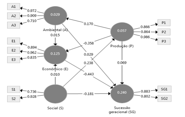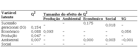 O constructo que apresentou maior Q² foi Sucessão geracional, indicando que o modelo permite prever 15,4% das possibilidades de sucessão familiar na amostra analisada (Tabela 2). Entre os constructos que apresentaram validade preditiva, este foi o mais representativo. Nesse constructo, constatou-se também que os fatores econômico e social influenciaram o Q² em 17,5% e 1,8%, respectivamente. Esses resultados indicam que, para haver maiores possibilidades de sucessão geracional na pecuária leiteira, é fundamental que as questões econômicas e sociais sejam bem desenvolvidas, ou seja, propriedades com problemas de desempenho econômico ou questão sociais pouco satisfatórias podem influenciar os sucessores a não darem continuidade ao negócio familiar no futuro.